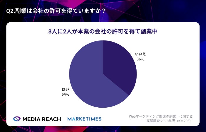 「副業は会社の許可を得ていますか?」という質問に対し、36%にあたる73人が「いいえ」と回答。一方、「はい」と答えた人は130人(64%)で、約3人に2人は会社の許可を得た上で副業に従事している。同調査では、全回答者のうち約半数(48.8%)が本業でもWebマーケティング関連業務に携わっており、7割以上(71.4%)は副業で得た知識や経験が本業に役立っていると考えているというデータも示されている。